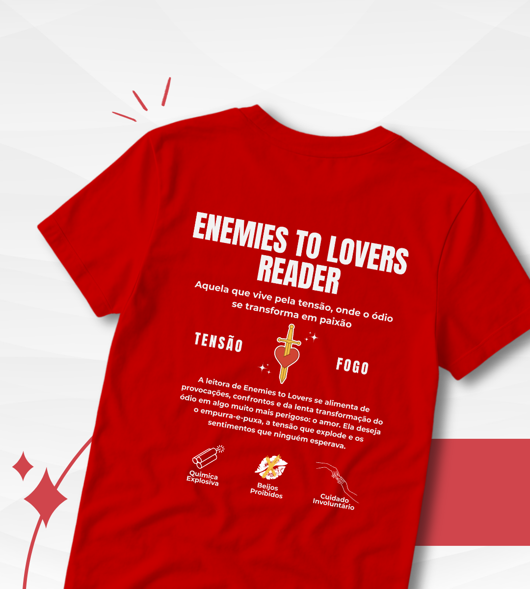 Perfeita pra quem ama ver dois personagens que não conseguem se suportar trocando farpas até se jogarem um nos braços do outro — e a gente amando cada segundo desse drama. Com a estampa Enemies to Lovers, essa camiseta é a escolha certeira pra quem torce pelos casais mais explosivos dos livros. 🫣❤️🔥