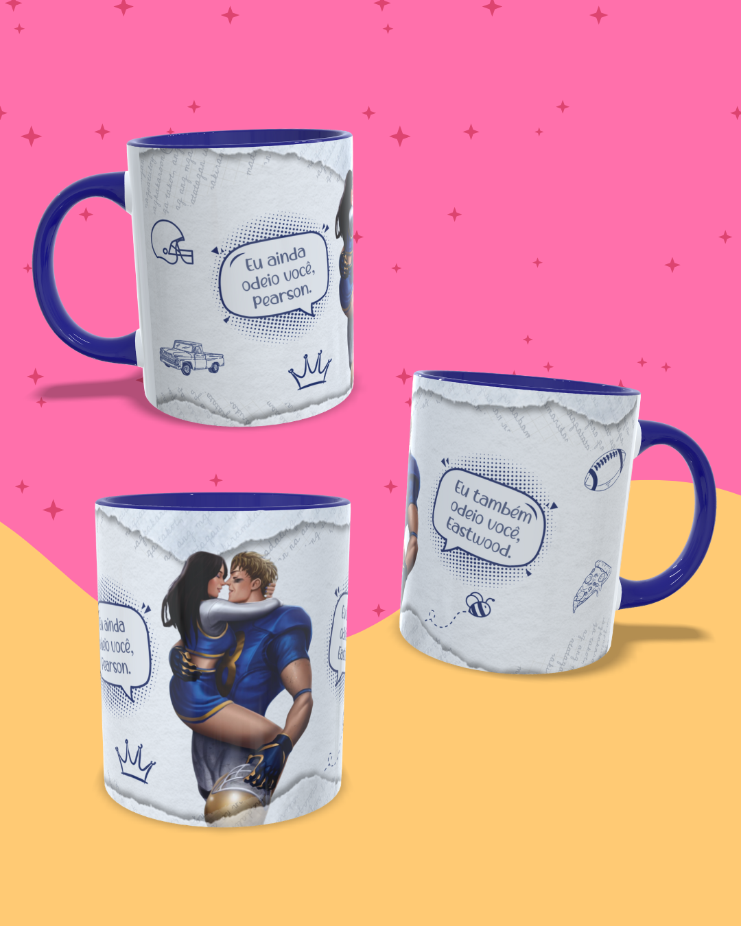 Nossas canecas são feitas em cerâmica resistente, possuem 325ml de capacidade e essa está disponível no modelo com alça e interior azul marinho, trazendo aquele charme extra pra sua leitura.